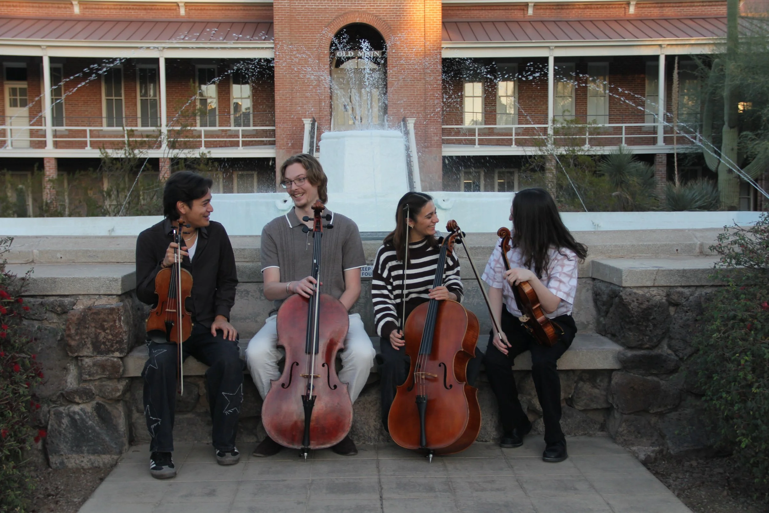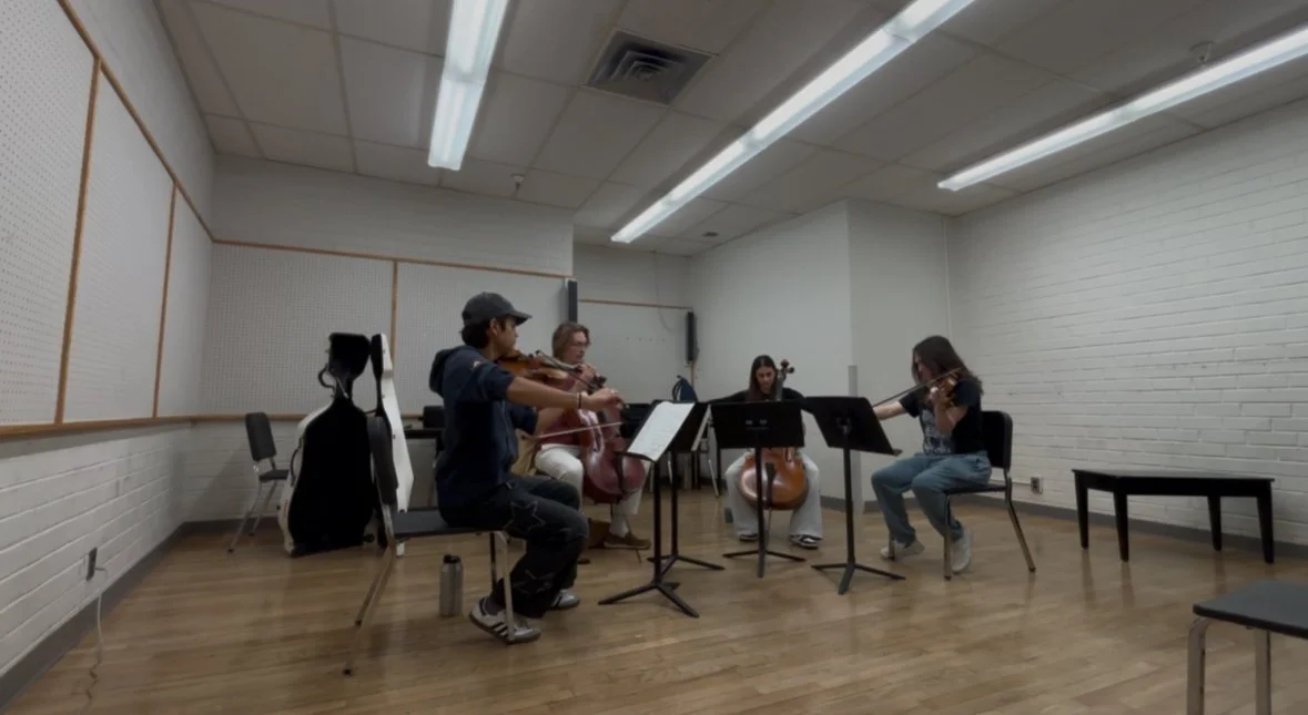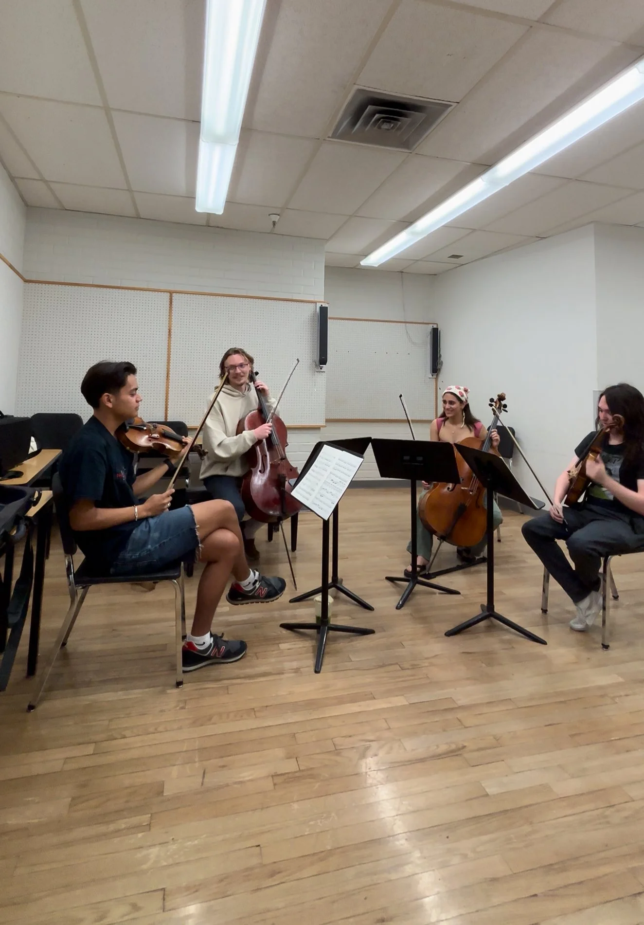 By the end of the eight weeks, we had officially completed and documented two interactive concerts in two different high schools and a beautiful recording of the first movement of Arensky quartet No. 2 from Haskell Recording Studio. Throughout the 2025 spring semester, we have been working hard on a large scale project of visiting students in our local area and introducing ourselves to new performance techniques in chamber music. Chamber Music is a lot different from orchestra, band, or even solo music. In our string quartet, each member is playing a different part of the same piece, making focusing on rehearsals early in the semester necessary for the rest of this project to be completed effectively. In March and April, we finally were ready to play singular movements to a standard performance level. During March and April, we visited two high school orchestras; Flowing Wells High School’s intermediate orchestra, and Tucson High School’s advanced orchestra. The goals for both of these schools was to start with engaging activities to immediately bring student attention onto what is happening in the music. For the first activity, we used animal sounds and had students mimic the volume and inflection of how each animal sound was made by each student. Afterwards, we had call and response, where students tried to imitate other students, then we had a follow the leader activity, and finally we got to perform for both the schools. An important learning moment for us was what went wrong with the call and response activities. At Flowing Wells, we initially tried to have students repeat phrases with moving notes, different bowings, and rhythms from the string quartet. We were immediately met with the reality that this wasn’t an effective way to carry out this activity. The next thing we tried was limiting it down to rhythm only for the THS performance, which was much more effective. The follow the leader activity was probably the most fun for students, as we had one student leave the room, and assigned a leader to another student. The leader would then lead other students to play a note in unison, all focused on making it look and sound just like the leader. The student would then come in and try and spot the leader. Despite the difficulty of this challenge, each student was able to find the leader with some guidance, and each student who participated got more experience with chamber music techniques. After an excellent couple of performances at THS and FWHS, our next goal was to explore the performance side. On April 14th, our quartet had the opportunity to go to the Haskell recording studio and have a first time experience as a string quartet recording together. It was an incredible experience! We got four takes, and despite the sound being dry in the studio, the sound on the video sounds amazing! We had a lot of fun completing this project. The teaching and performance aspects of the project made it very rewarding. View our final video below!
