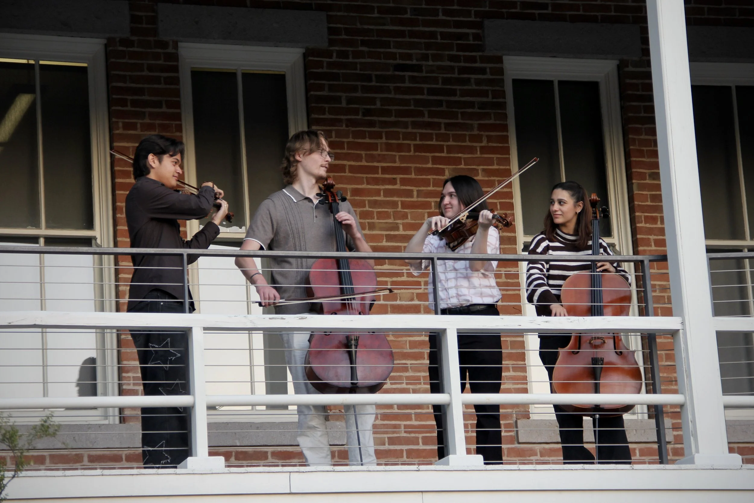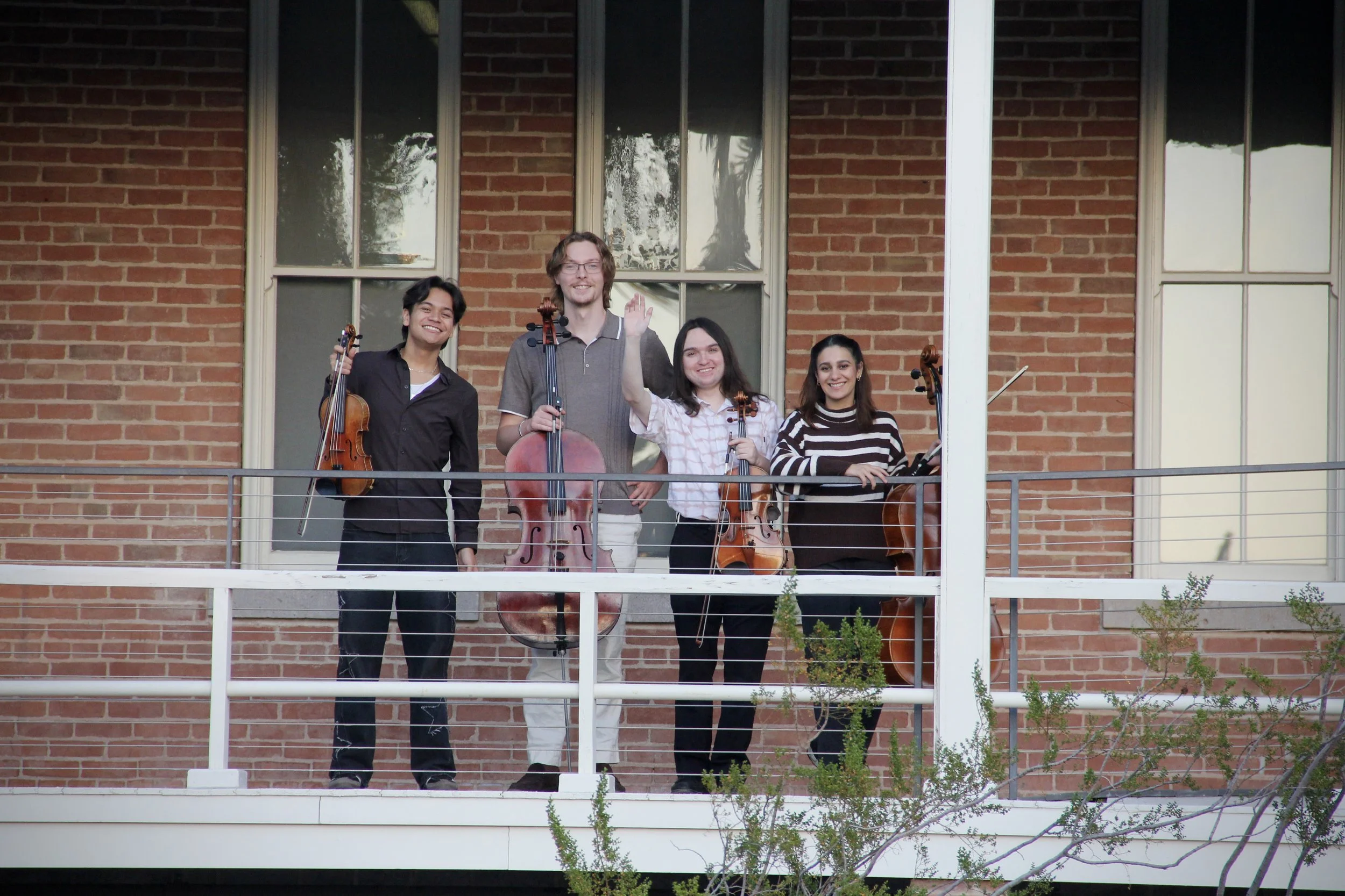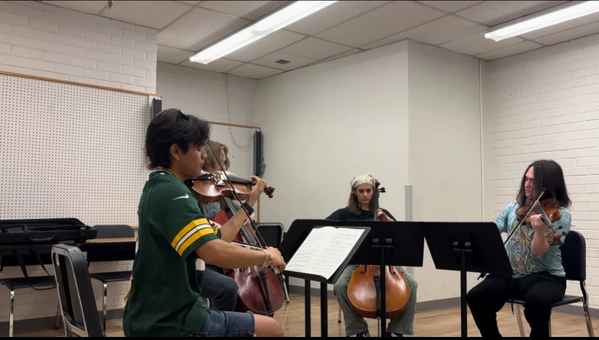 By the end of the eight weeks, we had officially completed and documented two interactive concerts in two different high schools and a beautiful recording of the first movement of Arensky quartet No. 2 from Haskell Recording Studio. Throughout the 2025 spring semester, we have been working hard on a large scale project of visiting students in our local area and introducing ourselves to new performance techniques in chamber music. Chamber Music is a lot different from orchestra, band, or even solo music. In our string quartet, each member is playing a different part of the same piece, making focusing on rehearsals early in the semester necessary for the rest of this project to be completed effectively. In March and April, we finally were ready to play singular movements to a standard performance level. During March and April, we visited two high school orchestras; Flowing Wells High School’s intermediate orchestra, and Tucson High School’s advanced orchestra. The goals for both of these schools was to start with engaging activities to immediately bring student attention onto what is happening in the music. For the first activity, we used animal sounds and had students mimic the volume and inflection of how each animal sound was made by each student. Afterwards, we had call and response, where students tried to imitate other students, then we had a follow the leader activity, and finally we got to perform for both the schools. An important learning moment for us was what went wrong with the call and response activities. At Flowing Wells, we initially tried to have students repeat phrases with moving notes, different bowings, and rhythms from the string quartet. We were immediately met with the reality that this wasn’t an effective way to carry out this activity. The next thing we tried was limiting it down to rhythm only for the THS performance, which was much more effective. The follow the leader activity was probably the most fun for students, as we had one student leave the room, and assigned a leader to another student. The leader would then lead other students to play a note in unison, all focused on making it look and sound just like the leader. The student would then come in and try and spot the leader. Despite the difficulty of this challenge, each student was able to find the leader with some guidance, and each student who participated got more experience with chamber music techniques. After an excellent couple of performances at THS and FWHS, our next goal was to explore the performance side. On April 14th, our quartet had the opportunity to go to the Haskell recording studio and have a first time experience as a string quartet recording together. It was an incredible experience! We got four takes, and despite the sound being dry in the studio, the sound on the video sounds amazing! We had a lot of fun completing this project. The teaching and performance aspects of the project made it very rewarding. View our final video below!